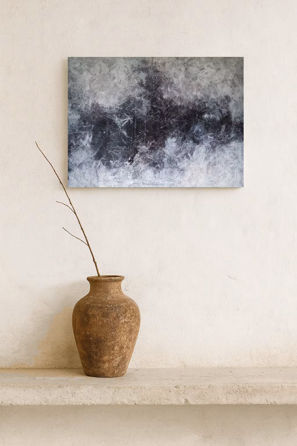 Eclipse is an abstract painting that captures the tension between light and shadow, silence and movement. Dark blues, deep grays and soft white merged together, creating a powerful sense of depth and mystery.