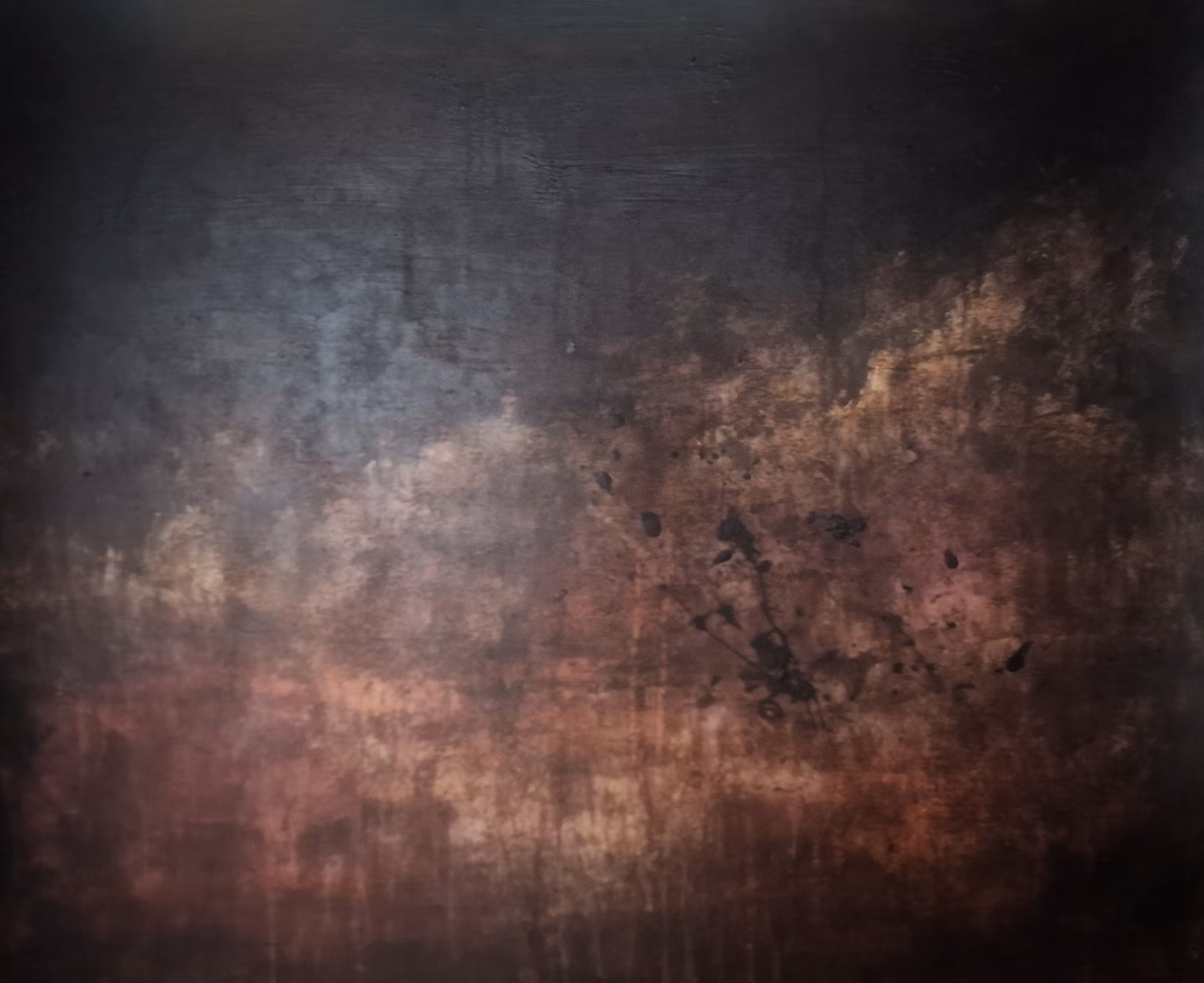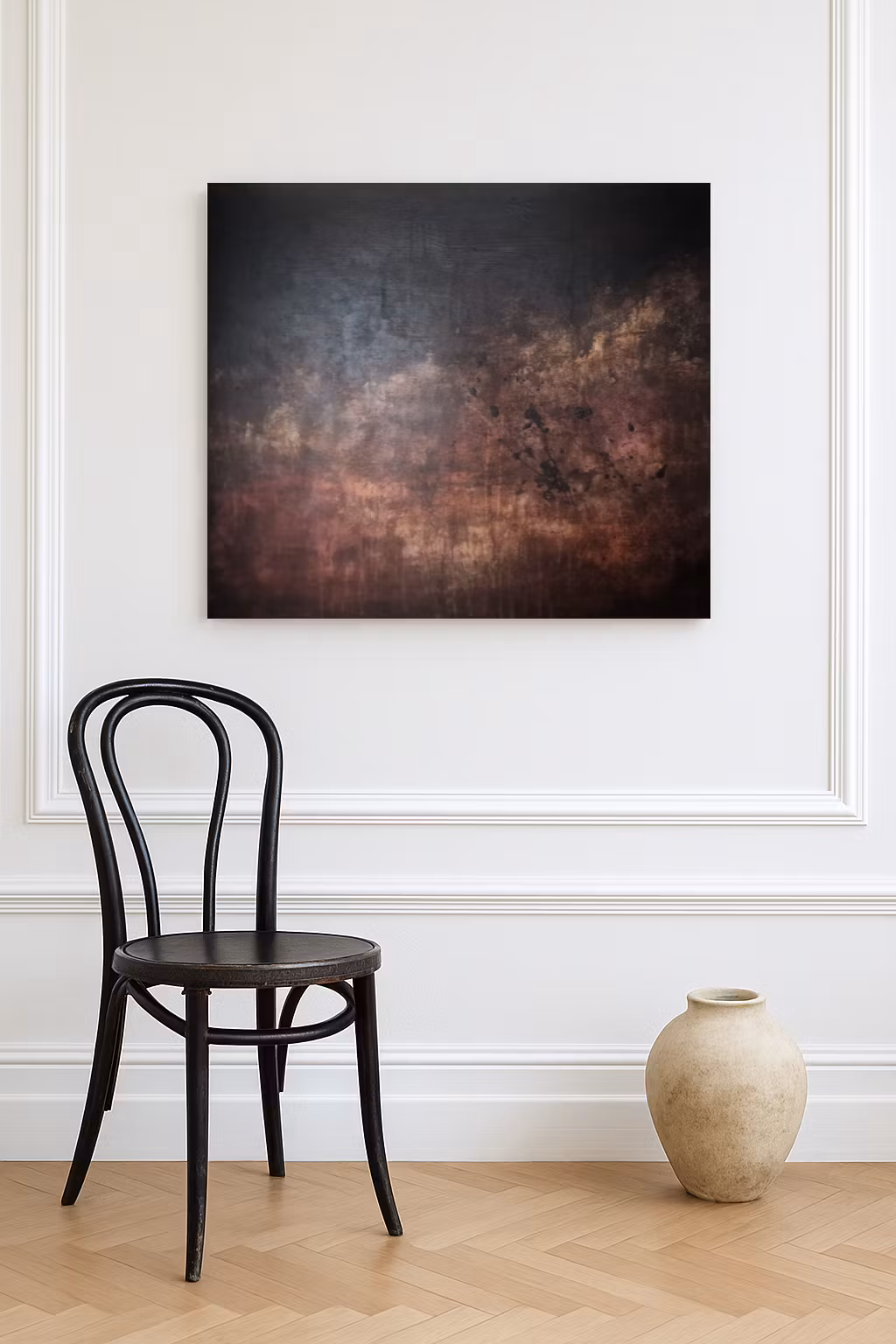 "Embers" is an abstract painting that captures the quiet glow of light against darkness. Deep blacks and rich browns merge with fiery reds and copper tones, creating the impression of glowing coals or a night sky shimmering with hidden sparks.