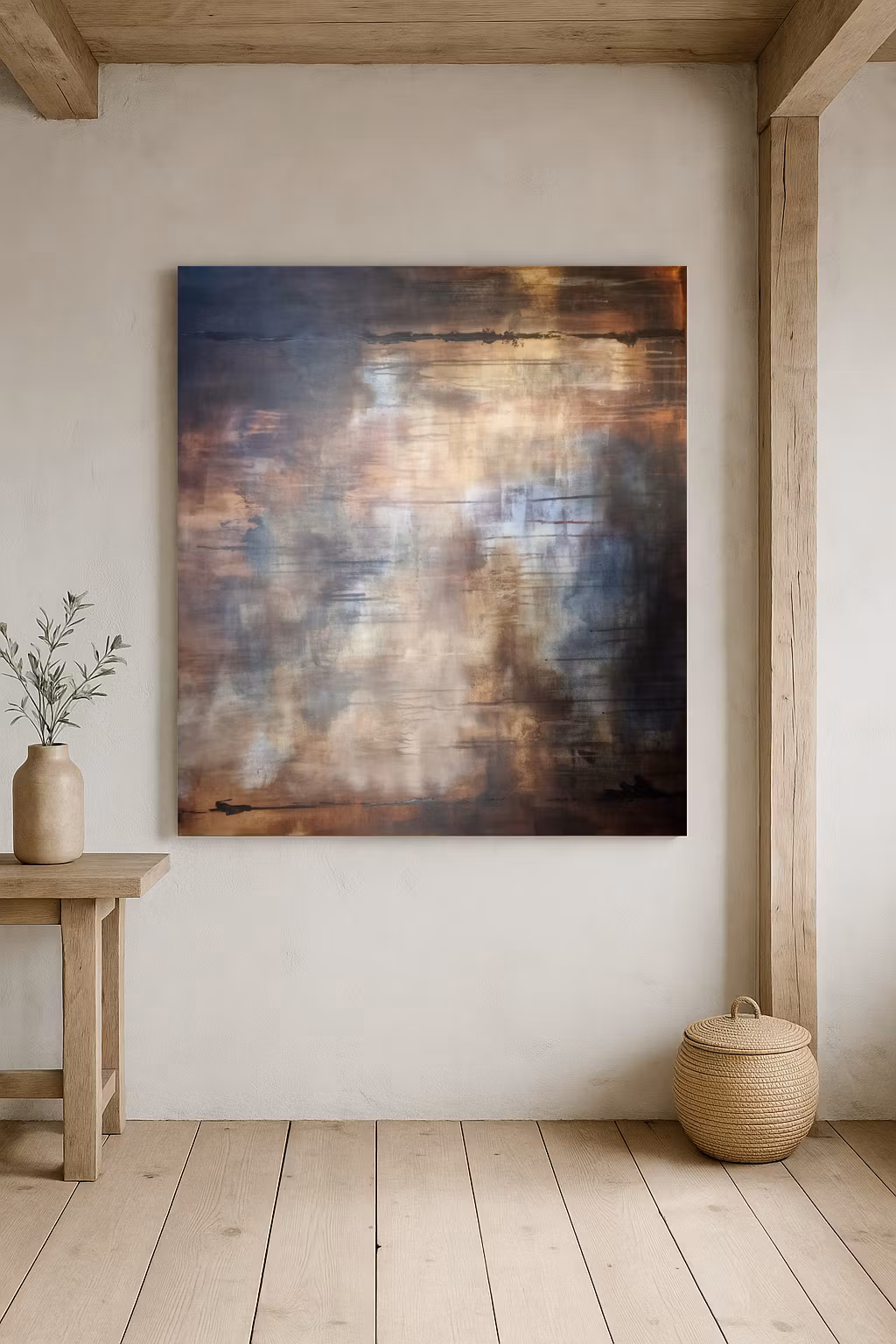 The piece reflects the raw beauty of natural surfaces, like fog drifting over a rugged landscape. It invites the viewer into a calm yet powerful atmosphere, perfect for spaces that embrace rustic elegance and modern abstraction.