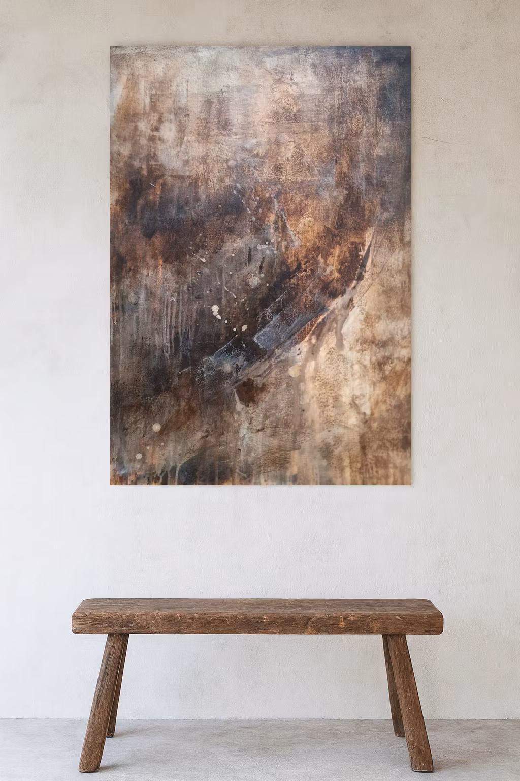 "Muddy Ways" from my serie 'Hippie Road', is an abstract painting inspired by nature's raw and untamed paths. Earthy browns, deep shadows and textured layers creates the impression of winding trails carved through soil and stone.