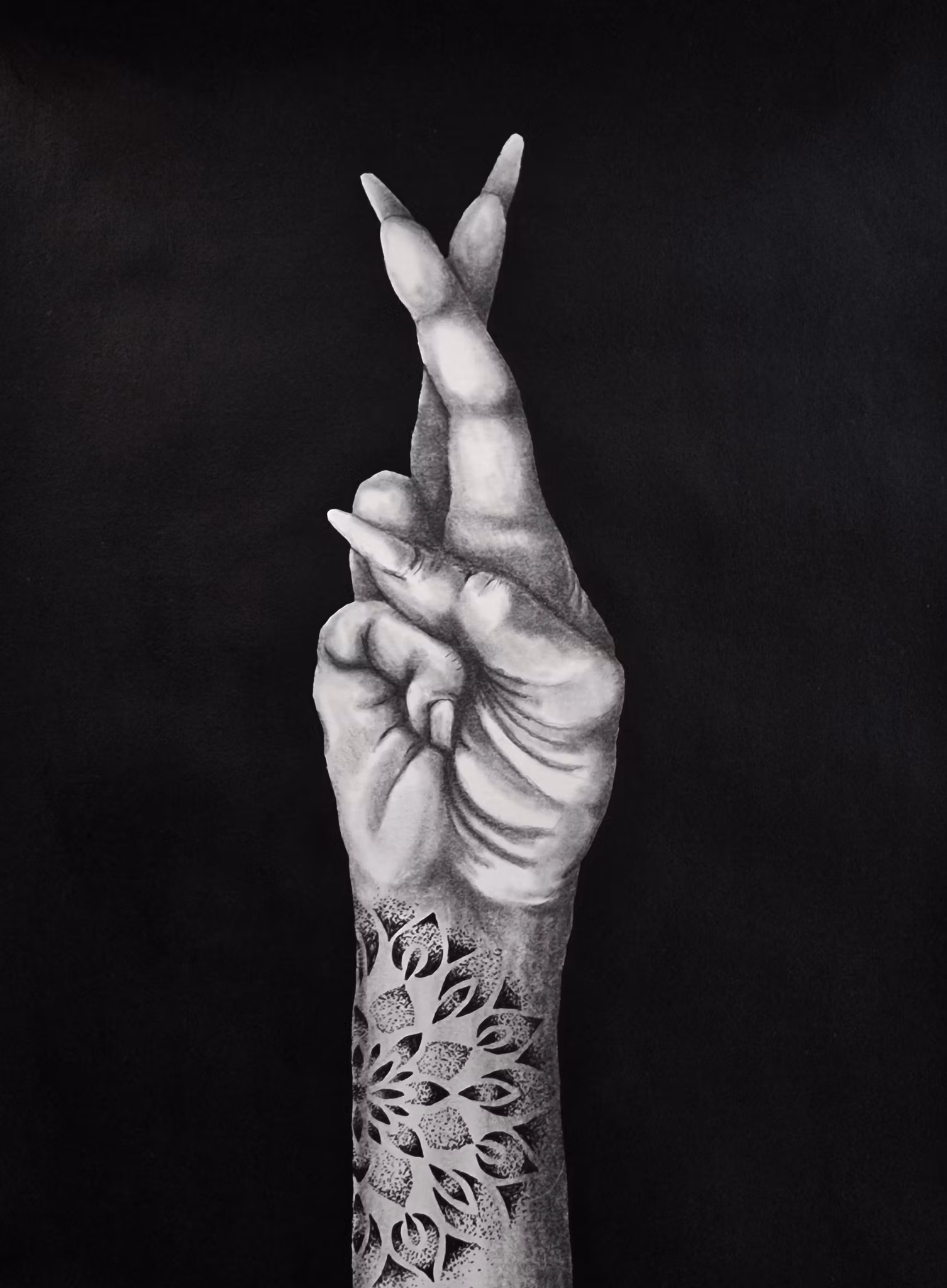"Stay Positive" from my serie 'Stay' is a powerful black and white artwork radiating confidence and optimism. With the iconic gesture of hope.