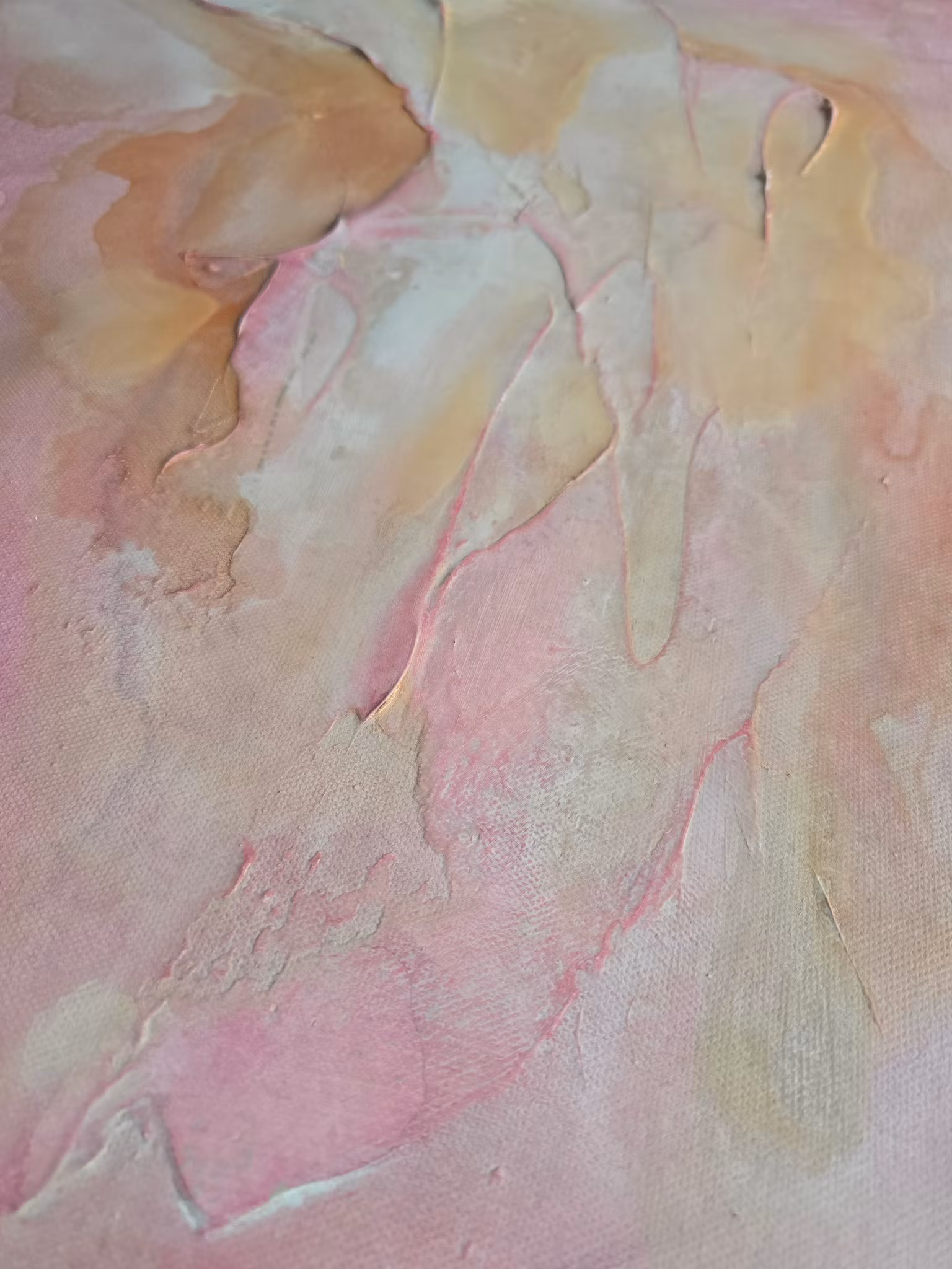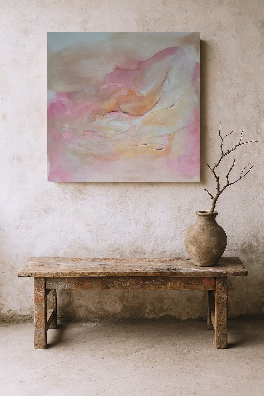 "Calm Ember" from my serie 'Veins of Earth' is a gentle and atmospheric abstract that invites the viewer to slow down and breathe. Soft blush tones blend with warm earth hues, creating a sense of quiet movement, almost like petals drifting in the breeze or the sky just before sunrise. The layered texture adds depth and subtle emotion, giving the work a tactile presence that feels both intimate and expansive.