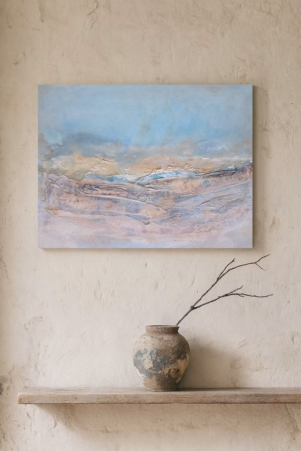 Layers of textured color unfold like distant hills at dawn, revealing hidden warmth beneath a quiet haze. Both fragile and eternal, this piece captures the essence of serenity, imagination and the secret places where wonder still lives.