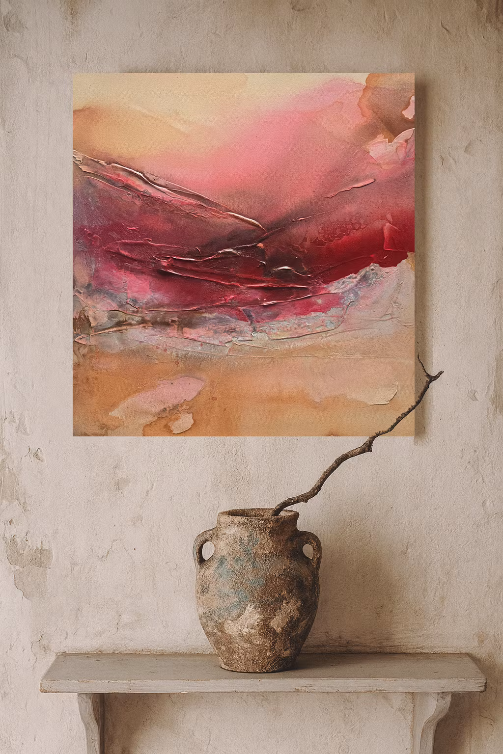"Veiled Ember" from my serie 'Veins of Earth' is an abstract painting that captures the delicate tension between warmth and depth, where crimson layers melt into soft beige and rose tones. The textured surface with it's organic cracks and flowing pigments evokes both vulnerability and quiet strength.