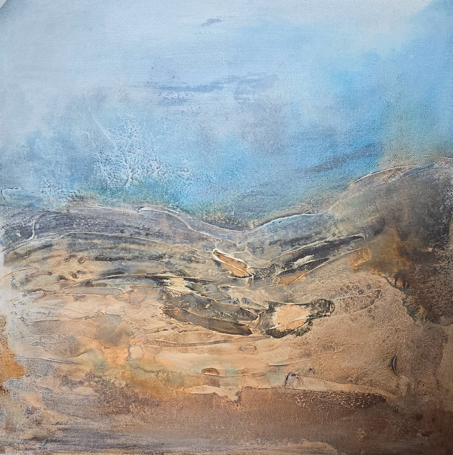 "Whispering Dunes" from my serie 'Veins of Earth' is an abstract painting inspired by the shifting beauty of desert landscapes. Warm and sandy browns and golden earth tones flow into soft blues, creating the impression of endless dunes under an open sky.