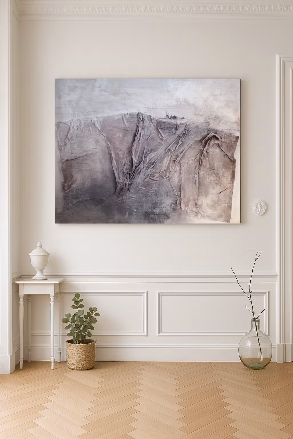 Whispers is an abstract painting that captures the quiet poetry of lines and shadows. Soft layers of grey, blush and neutral tones on a cotton cloth and canvas are broken by deep black strokes, evoking the feeling of branches, cracks or fleeting memories on a surface.